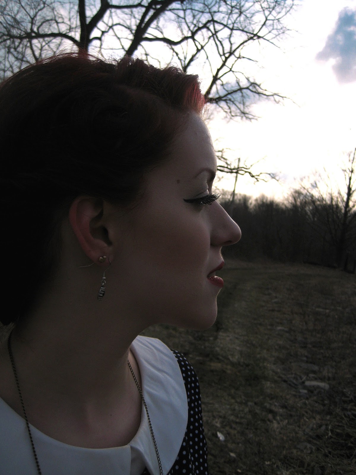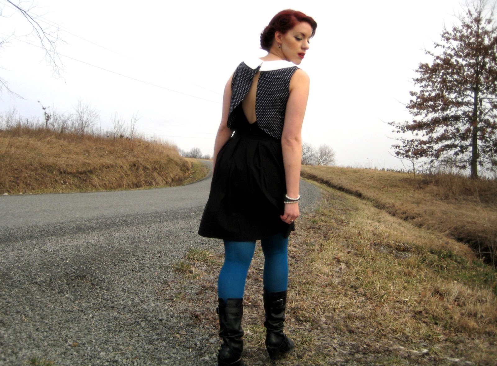 I paired it with bright tights and super bright red lipstick to make up for the darkness. I think with this dress it’s important to wear the hair up, to show off the back. The first time I wore it I did a faux bob. But this time I wanted to be a little more vintage-y. It was also the perfect day to wear it, because I went shopping and ended buying Peter Pan on DVD. The irony wasn’t lost on me.