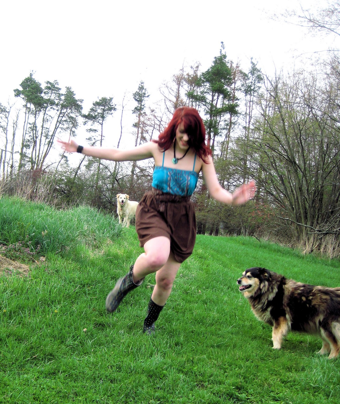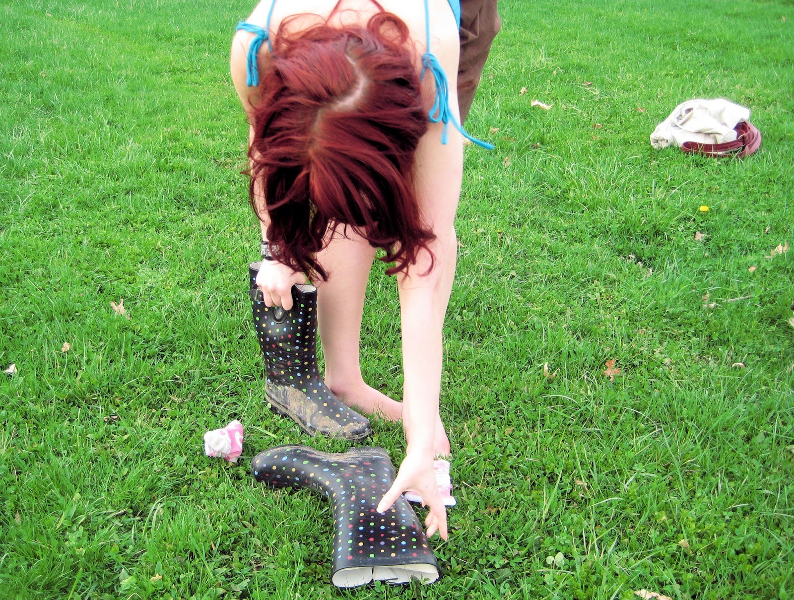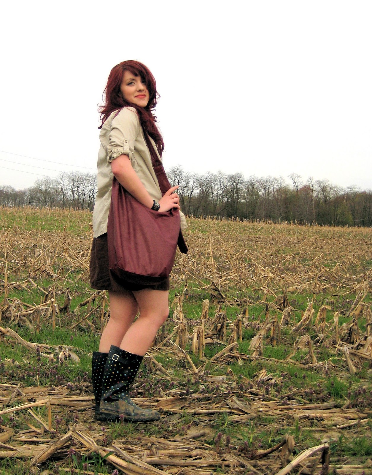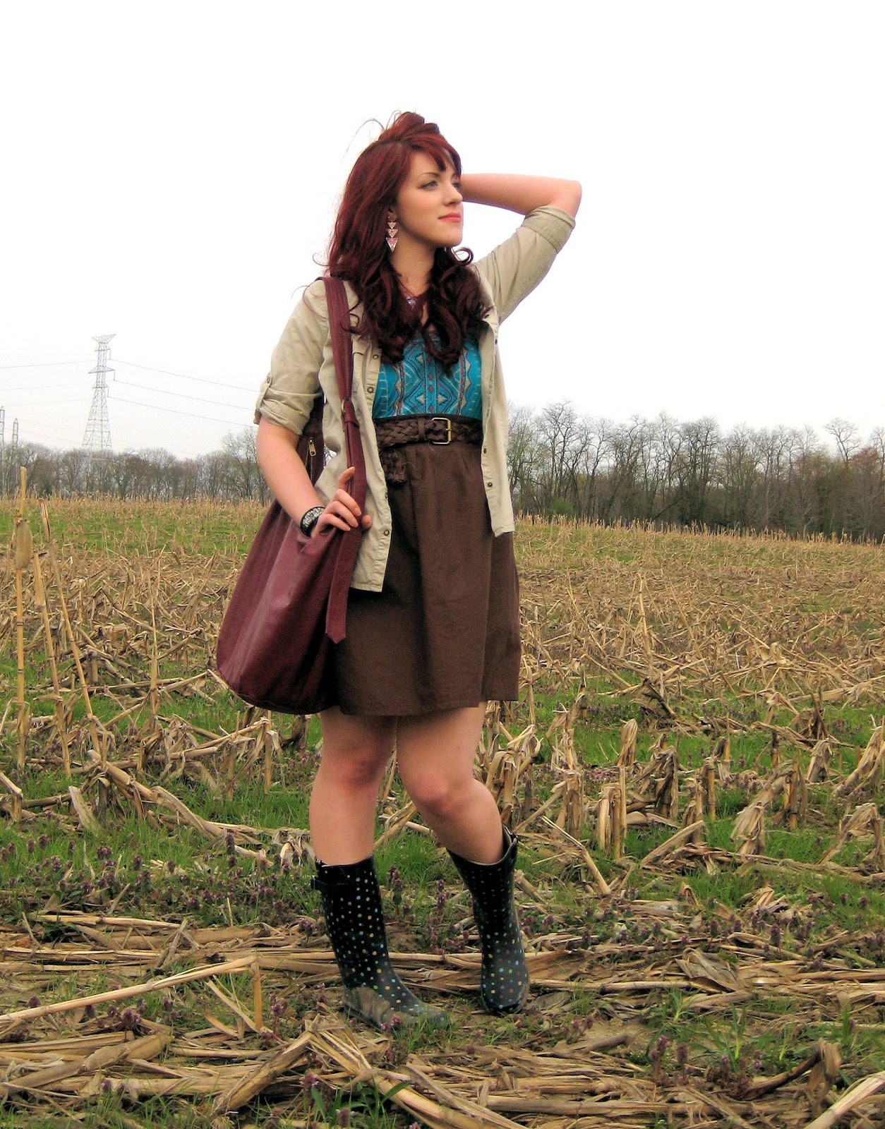 When it comes to trambling through fields, it is best to have the right shoes. Rain boots are for muddy exploring shoes. I really like how this outfit seems to reflect a wooded adventure, hopefully somewhere with good cloud coverage and very few mosquitoes. I rather really like the earthy tones at play. In case you haven’t noticed, I tend to migrate towards more statement colors. Here, I think the bright blue is the perfect addition to just give a little bit of a pop.