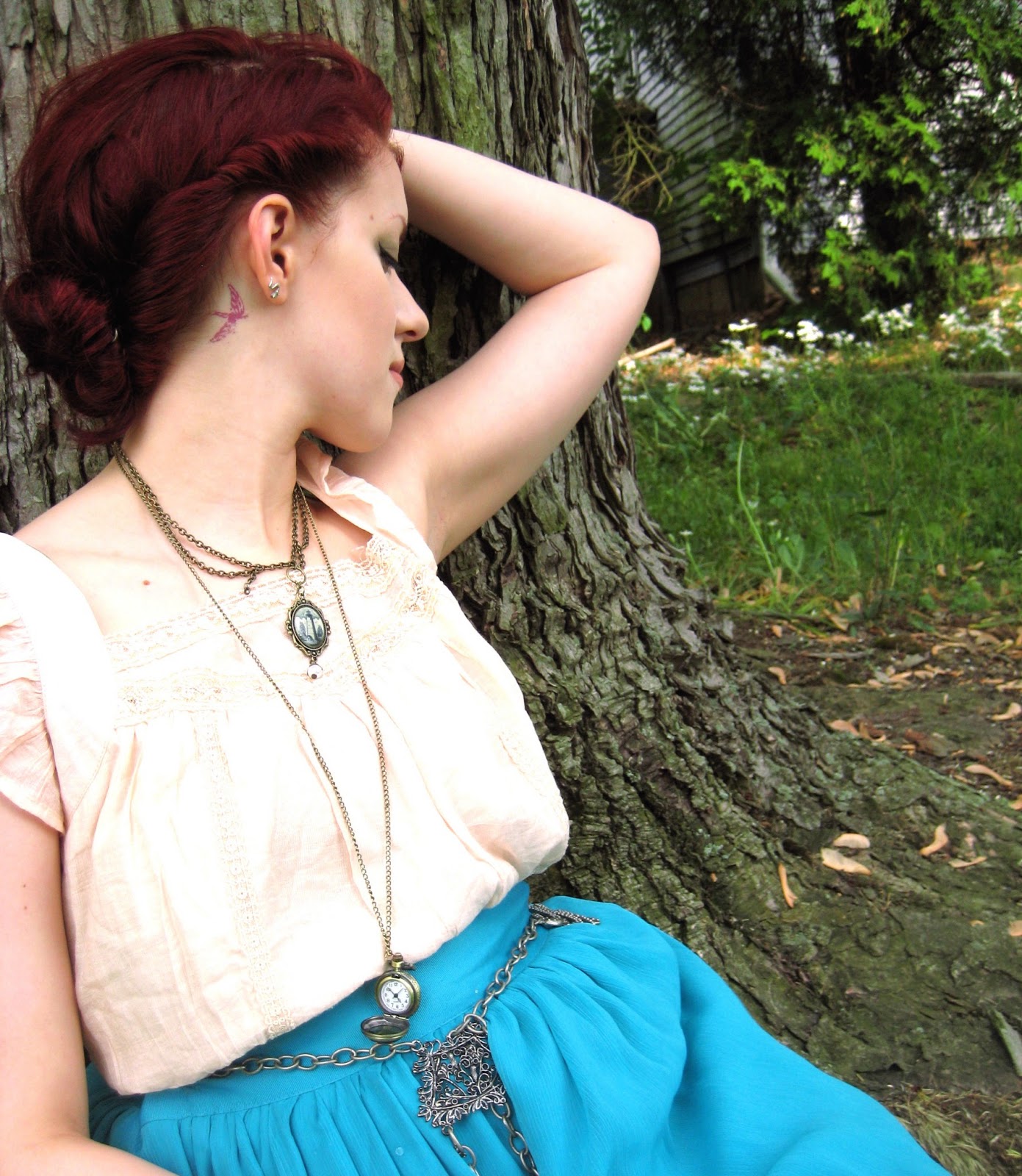 When I look at this outfit I kind of just want to sigh. I swear there is a magical fairy who sometimes graces us with the best outfit ideas ever. Once upon a time I thought Victorian fashion was awkward and I didn’t care for it at all, however over the years I’ve found myself falling head over heels with anything Victorian and with lace. When this dress first arrived I admit I was disappointed, but that disappointment left quickly when I discovered how to make it compliment my figure. This skirt was a last second grab. I didn’t even try it on because there was only one. It needs taken in, but for now safety pins work just as well. I love the color, a mermaid color my sister called it. Which might explain exactly why I like it.