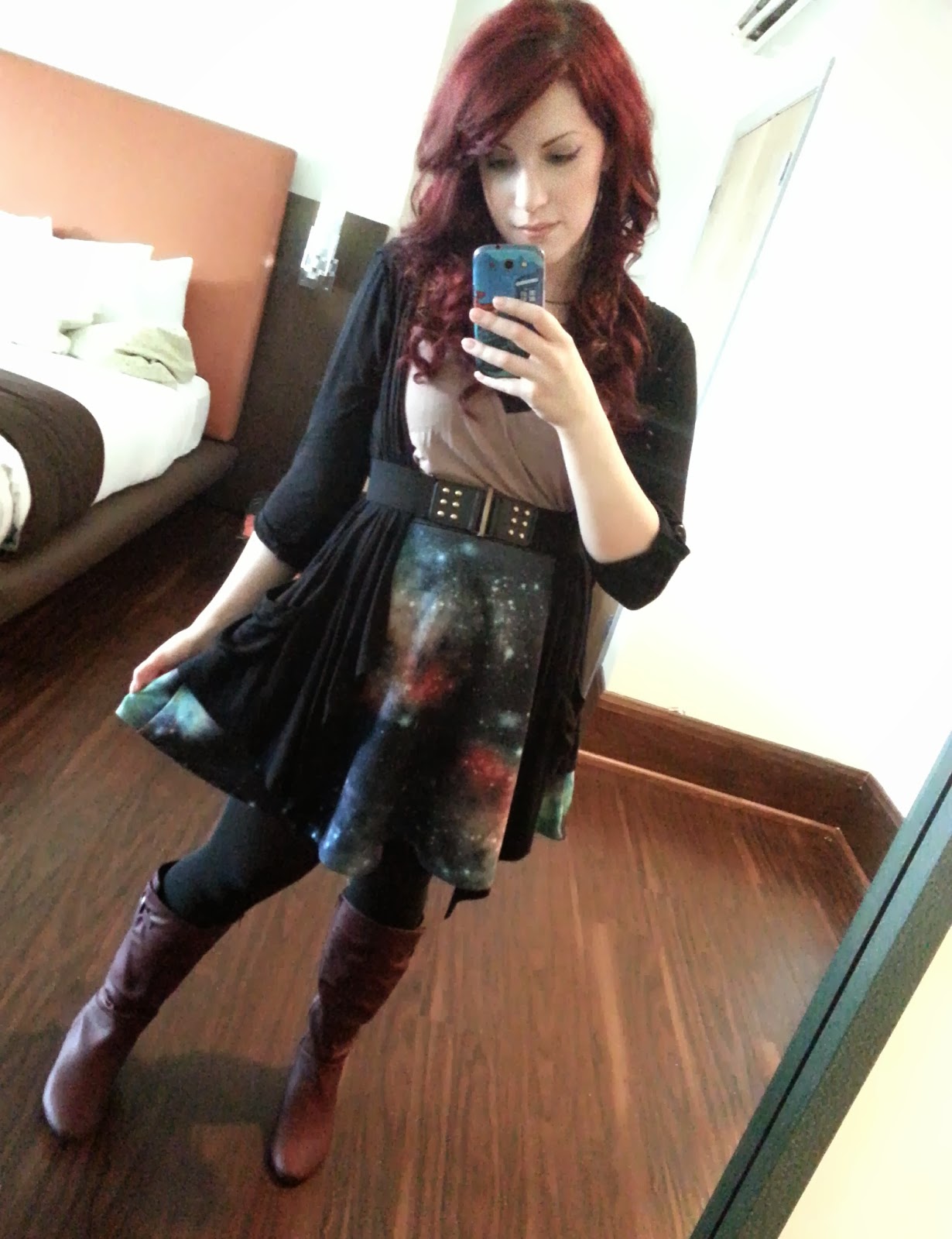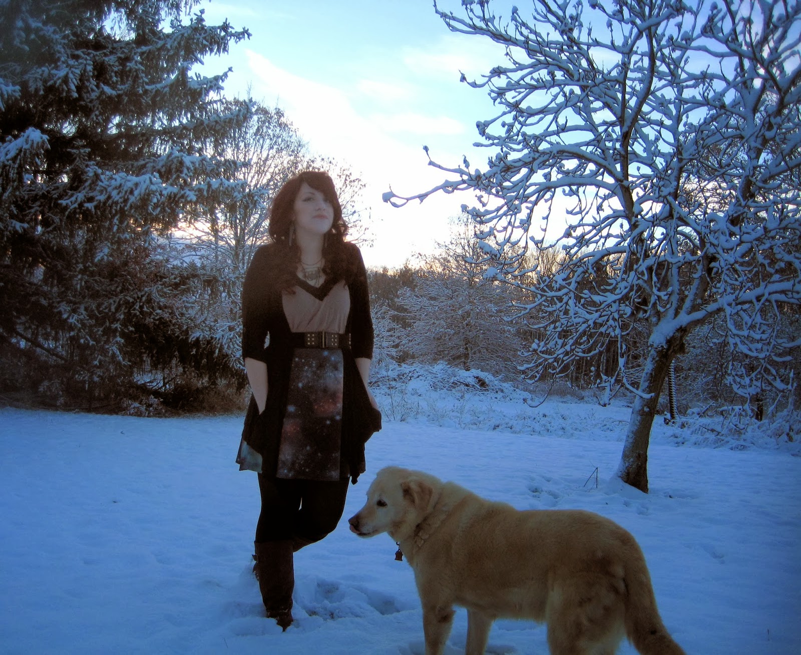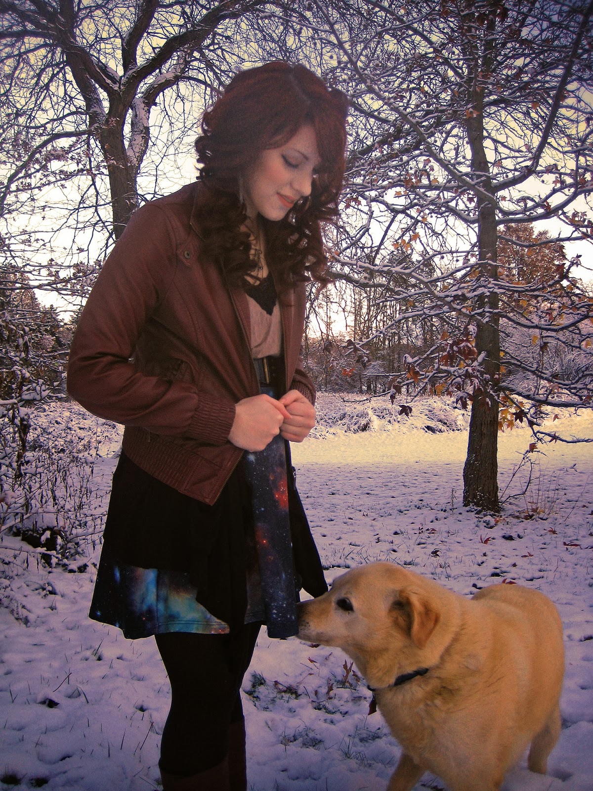 These photos are quite old, taken back in mid-November. It was our first major snow. I love these pictures, especially because my darling Ollie is so adorable in them. The pictures indoor were at a hotel we stayed at for a night. All of those were taken with my phone, as I forgot to bring my camera with me. I was rather impressed with how that one in the chair turned out, especially because I was balancing it up with a book and pen. This might be one of my favorite outfits ever. Super comfy which I needed for that day and I’m a sucker for that galaxy skirt.