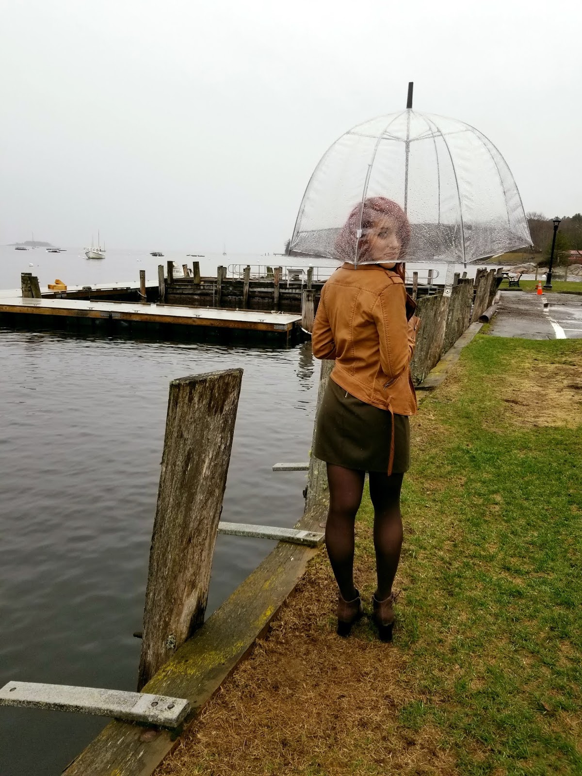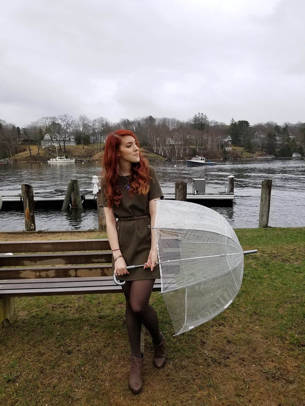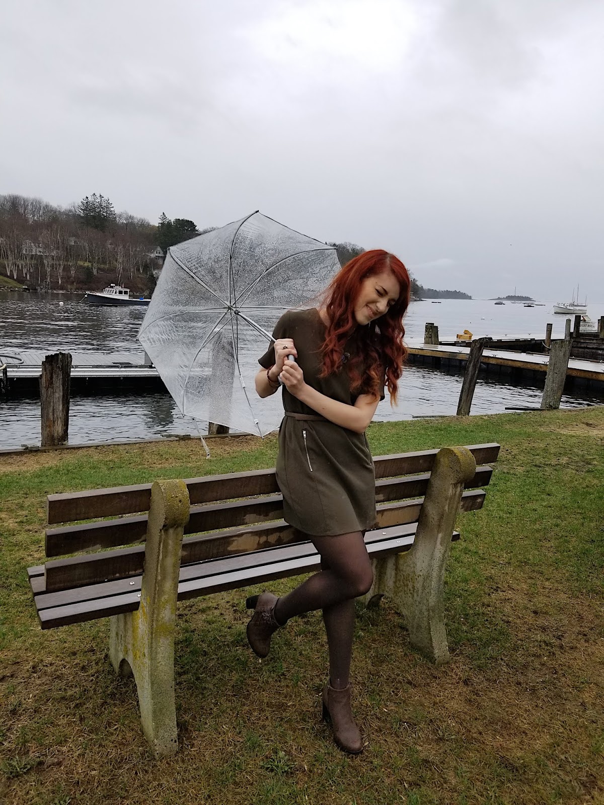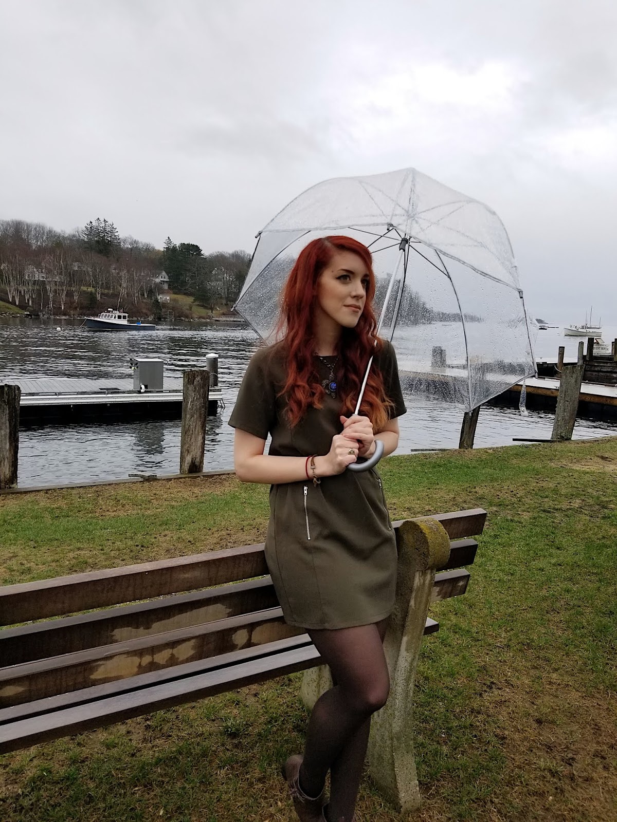 Outfit details: Jacket & Dress (TJmaxx) Tights & Umbrella (Target) Necklace & Ring (Vintage) Bracelet & Boots (Amazon)