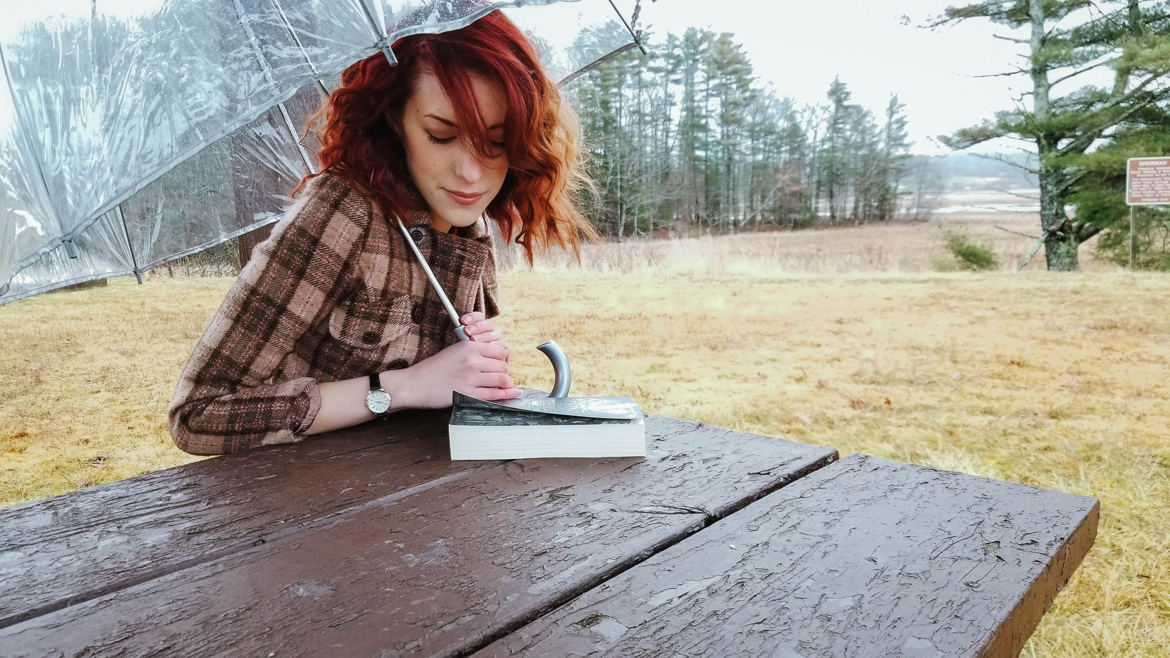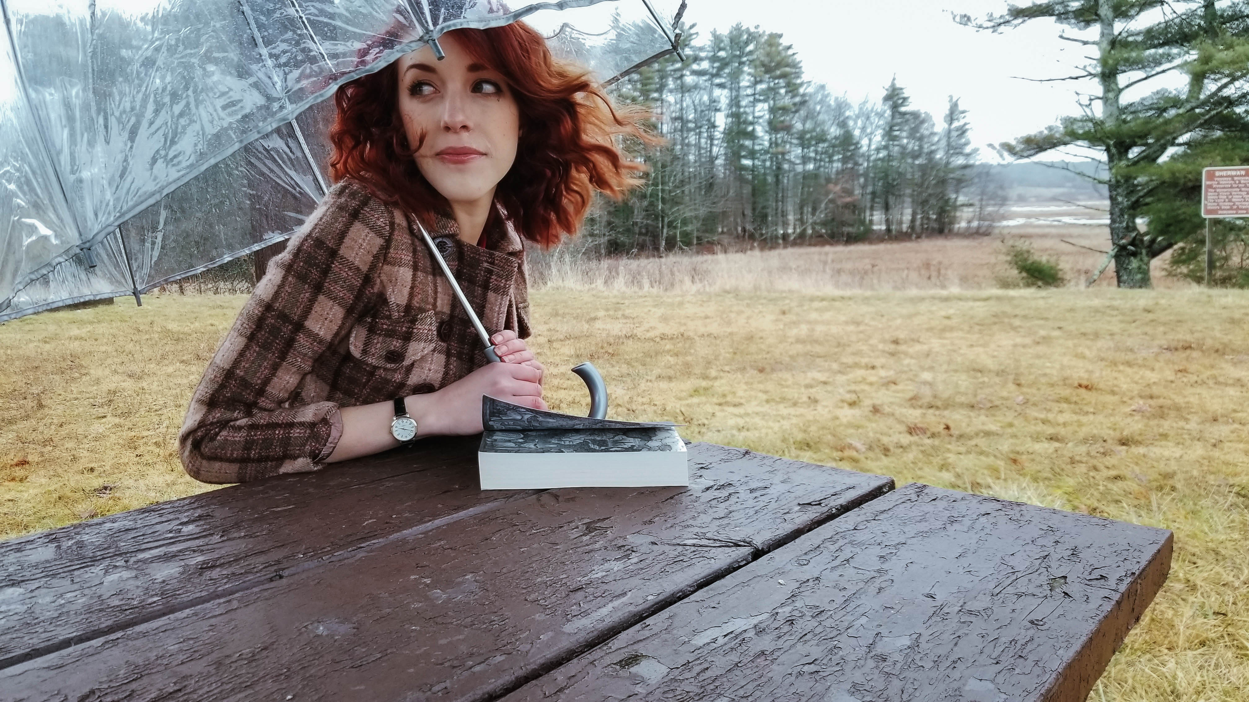 Outfit Details: Jacket (thrifted) Dress & Boots (Modcloth) Watch (Kohl’s) Umbrella (Target) Book (Dance of Thieves by Mary E Pearson)