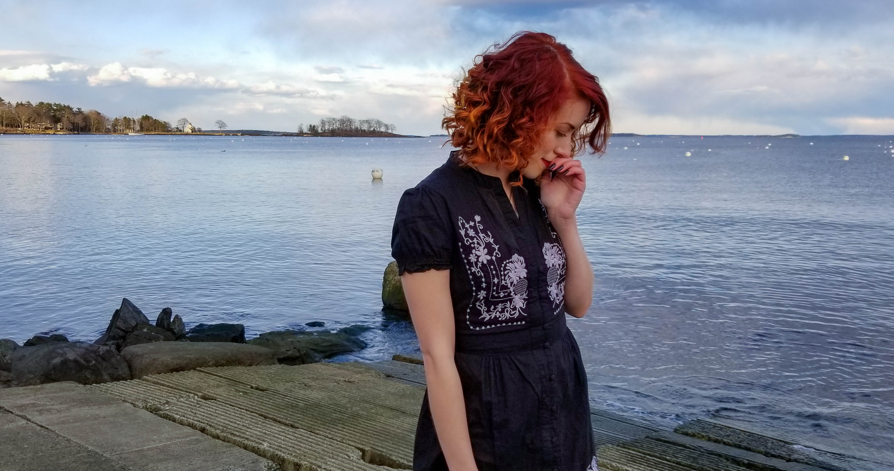 Outfit Details: Jacket (TJmax) Needlework it Out Dress & Boots (Modcloth) Necklace (vintage) Harry Potter Purse (HotTopic)