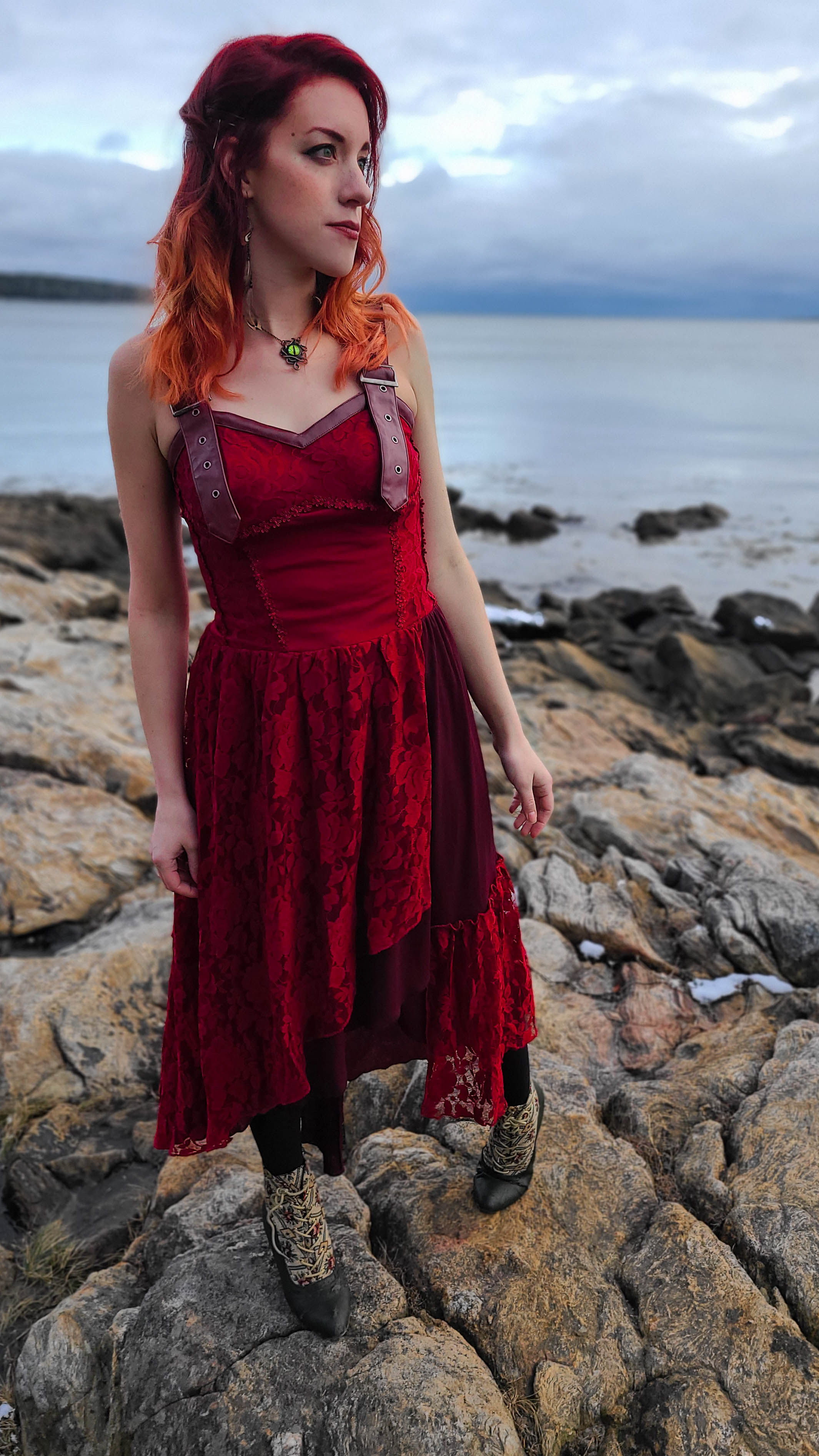 Outfit Details: Coat (Kohl’s) Blazer (TJmaxx) Steampunk Dress (amazon) Boots (Modcloth) Necklace (gift) Earrings (Forever21) Dagger (Mont st Michel)