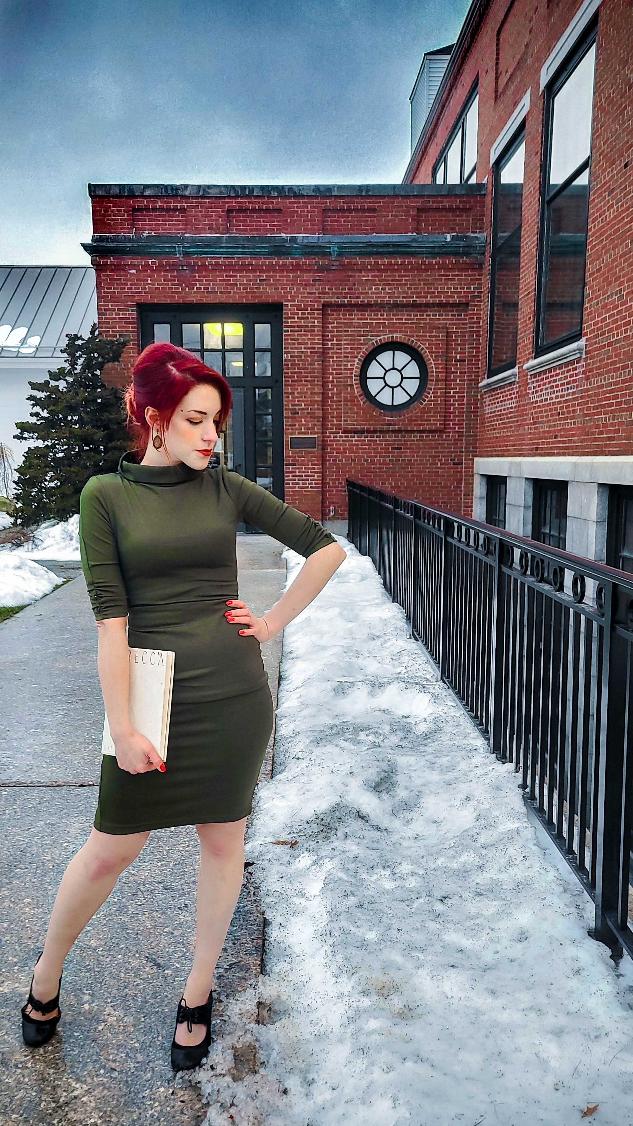 Outfit Details: Coat (Pull&Bear) Dress (amazon) Heels & Earrings (ModCloth) Book (Rebecca by Daphne du Maurier)