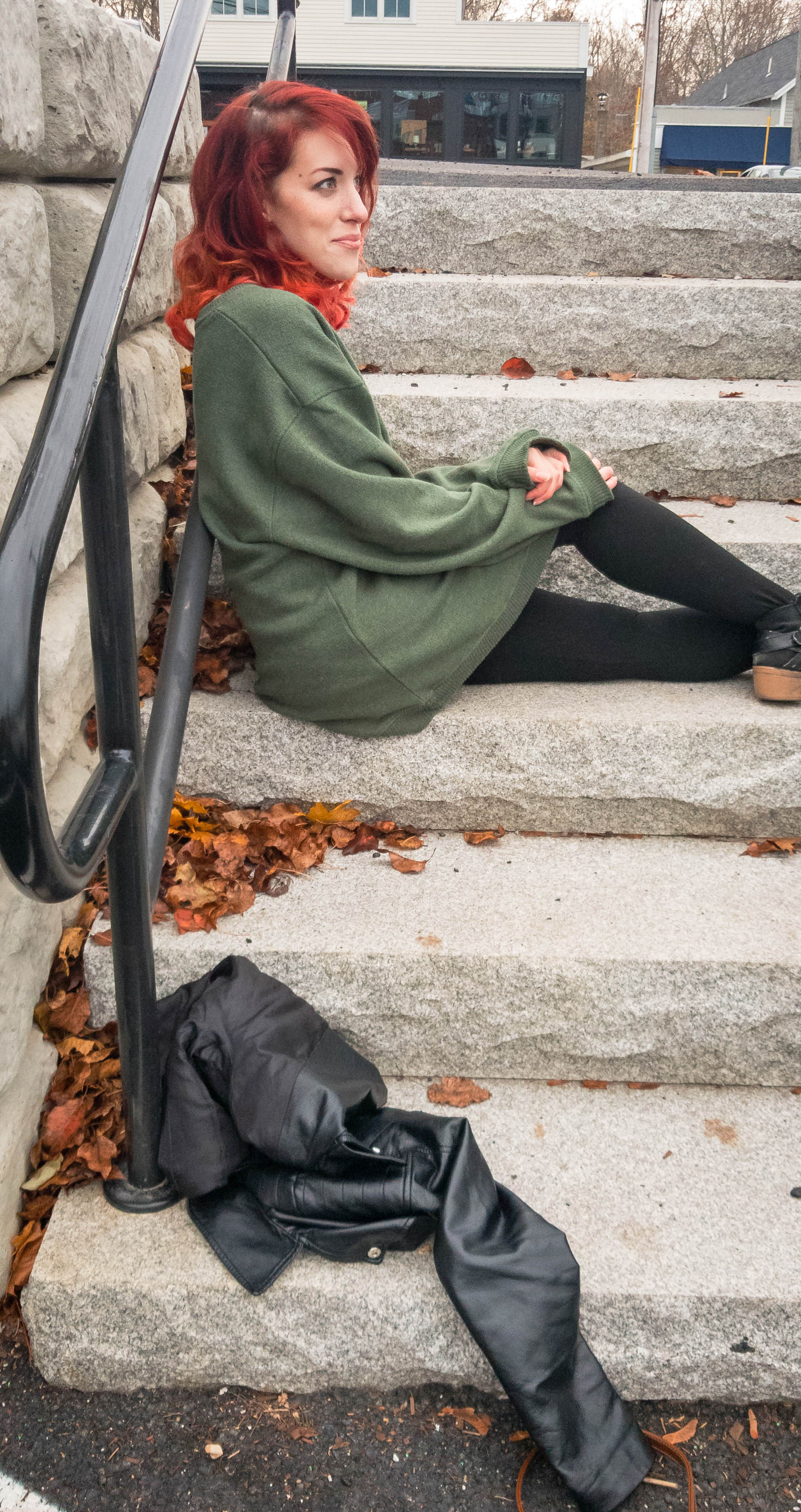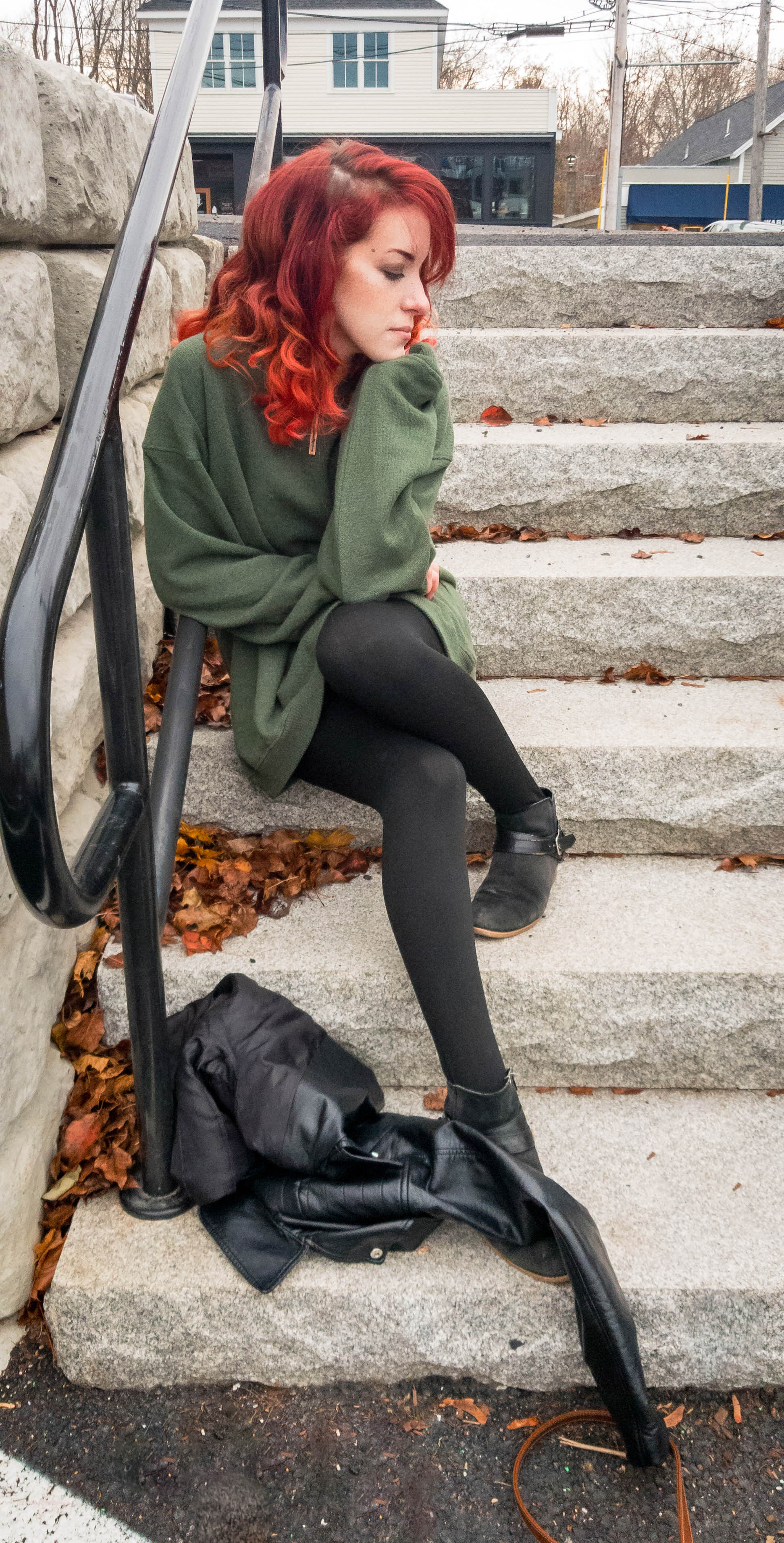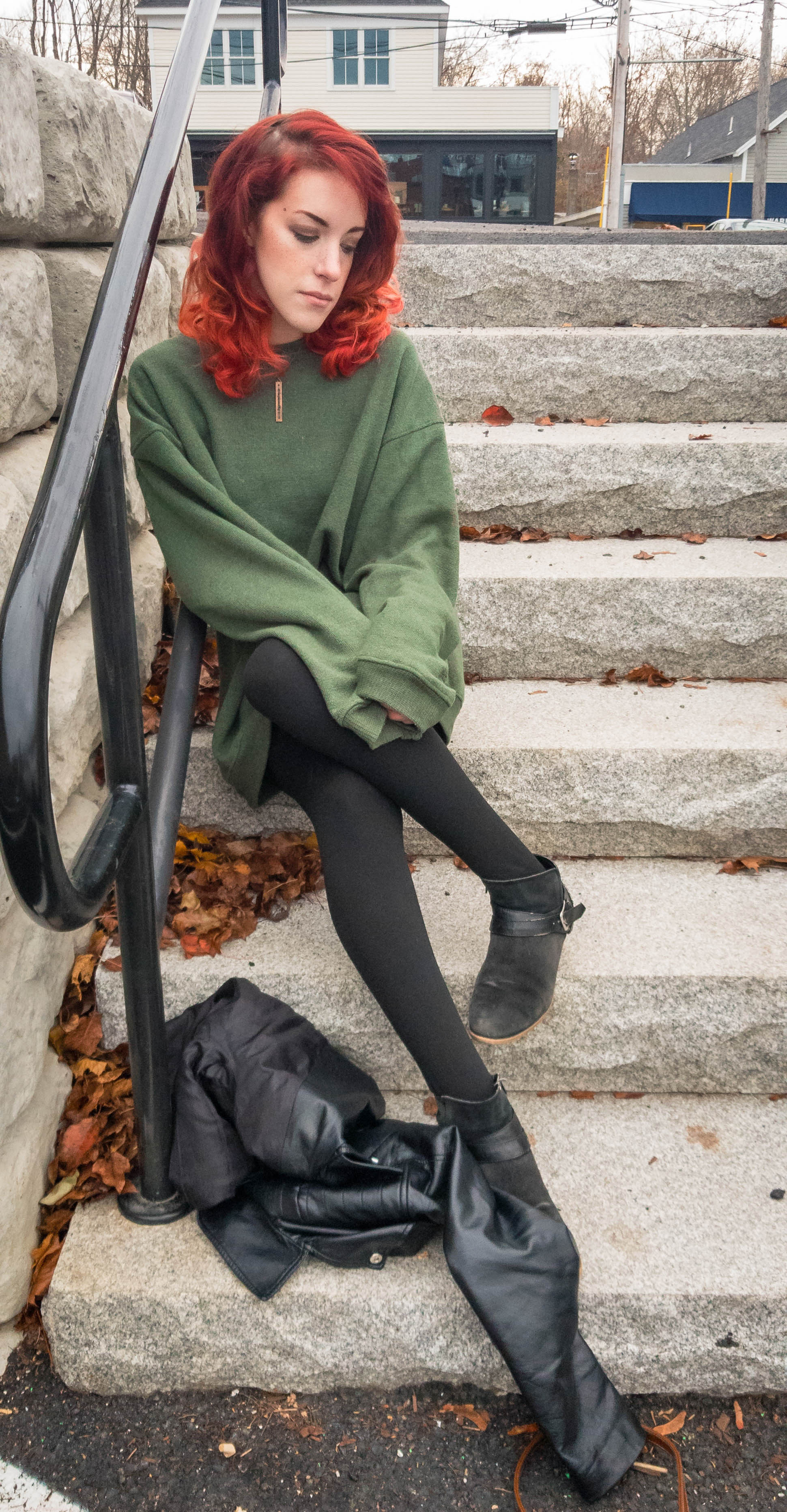 Outfit Details: Sweater & Leggings & Jacket (TJmaxx) Boots (White Mountain) Purse (Goodwill) Necklace (Modcloth)